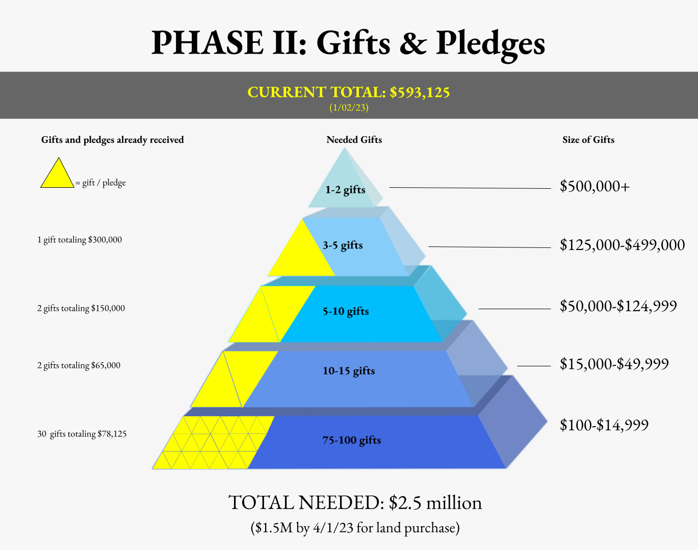 In other news, below is the giving update for the Phase II capital campaign as of New Years Day. We’ve had 35 different giving units (households) make contributions so far with a tally of just under 600k. We’re off to a great start. We’re giving God thanks and praise for a fantastic 2022!