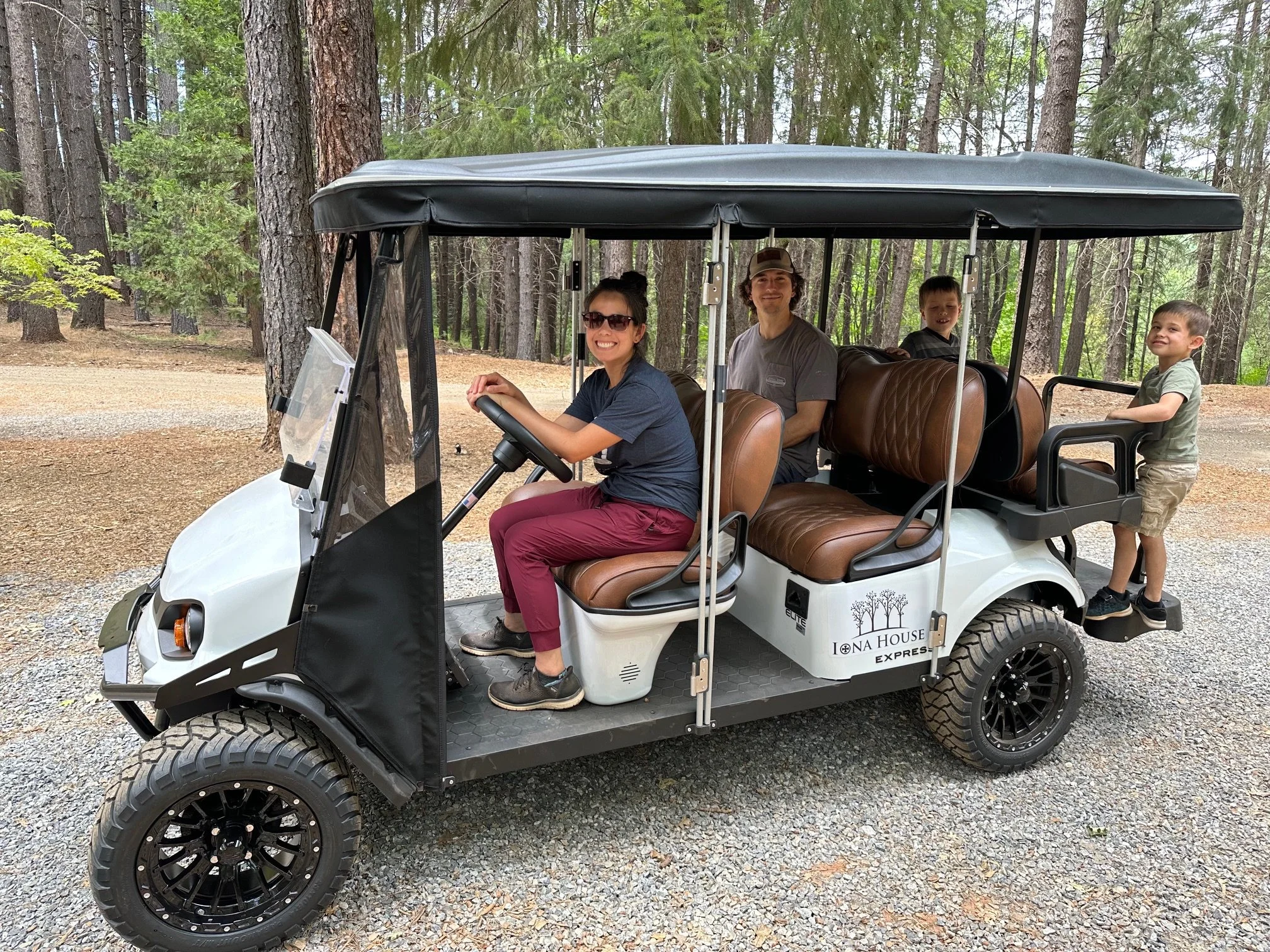 We are so THRILLED to have received a VERY nice golf cart a few weeks ago. This was the gift of a family who believed we needed a bigger and better vehicle for taking people around the campus. It anticipates the future when we will have a few more of these electric carts to use on campus. We use the Iona House Express for campus tours or to help people get from one place to another. It is far too nice to be used as “work vehicle,” so we leave that for our trusty old Kawasaki Mule. The Iona House Express has an entire set up for rain with doors and a full enclosure to keep folks dry in rainy seasons. It is fully electric and very powerful - plenty enough to get up and down the steepest trails. It is lifted off the ground by nearly a foot and has great off-road tires. One of the best parts about this vehicle is that it is nearly silent when running.